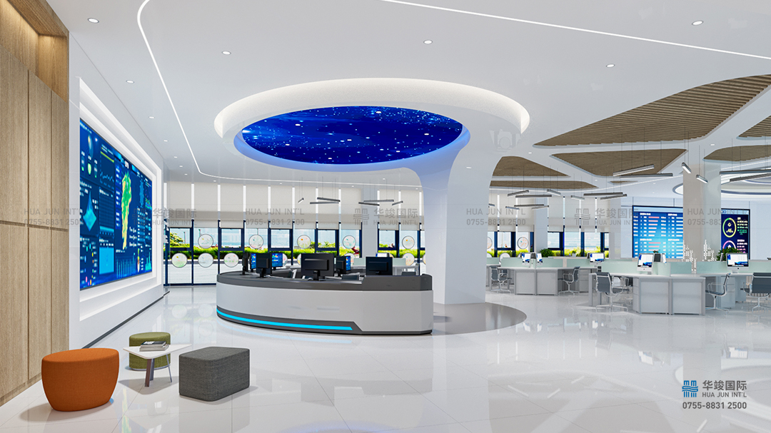以現(xiàn)代簡約的空間構(gòu)建手法,以氣象和數(shù)據(jù)為空間元素,打造簡約大氣,重點(diǎn)突出的前廳接待空間。頂部天花用氣象的 LOGO勾勒出整體天花的設(shè)計(jì)感,墻面發(fā)光的數(shù)據(jù)表達(dá)大數(shù)據(jù)的元素,同步中間光效層層包裹中嵌入一塊LED大屏,播放江西智氣象空間全面的視頻介紹片。有時(shí)候也可以作為歡迎屏,切換歡迎詞來使用。