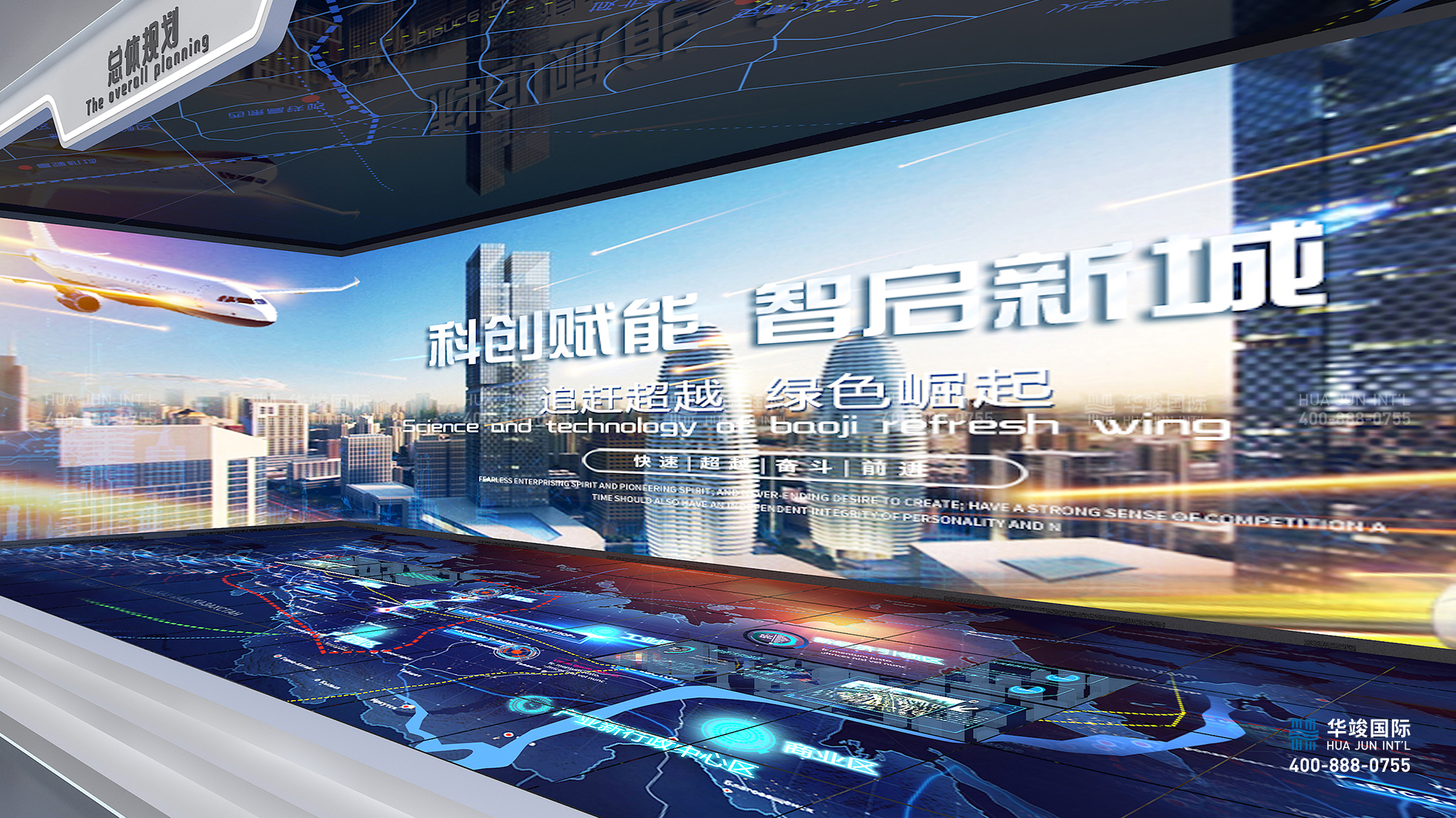 總體規(guī)劃主要內(nèi)容為一心/兩軸/三組 團(tuán)的總體規(guī)劃布局,利用沉浸式數(shù)字沙盤體驗(yàn)數(shù)字科技感的空間氛圍,使參觀者身臨其境,切身融入到高新區(qū)科技新城的場(chǎng)景之中。