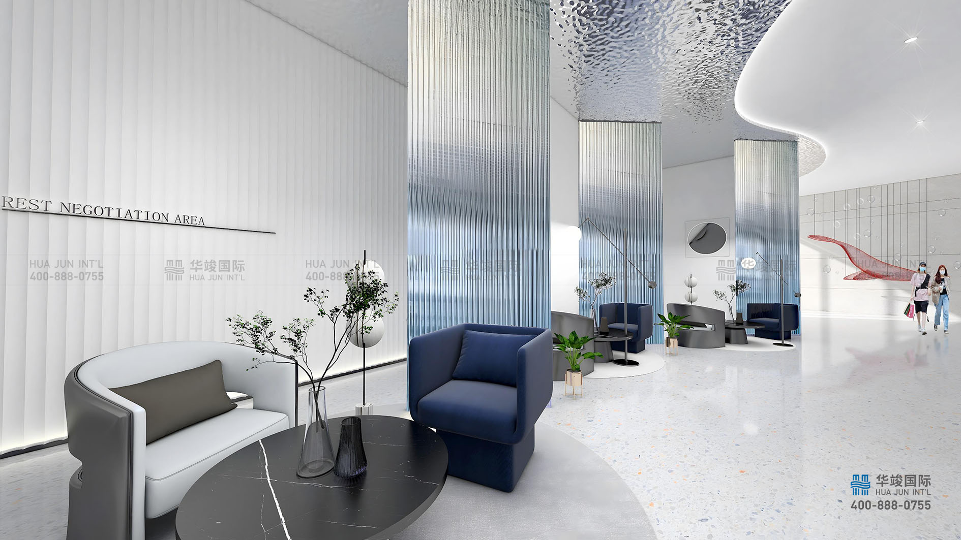 首層大廳整體空間延展伊通河“水”文脈,以水脈為中心脈絡(luò)敷衍到空間功能。延續(xù)空間功能,層層遞進(jìn),打造空間的韻律感。南側(cè)臨窗而立,伊通河秀美壯觀景色盡收眼底,打造水景景觀、藝術(shù)裝置的植入彰顯空間文脈意境,室內(nèi)與室外增設(shè)水景相聯(lián)。整體空間形態(tài)形似未來方舟!大廳中心規(guī)劃沙盤形體結(jié)合建筑郵輪外形塑造船型寓意大船啟航、動(dòng)態(tài)感十足,暢想未來長(zhǎng)春伊通河濱水文化新生活的活力長(zhǎng)卷。
