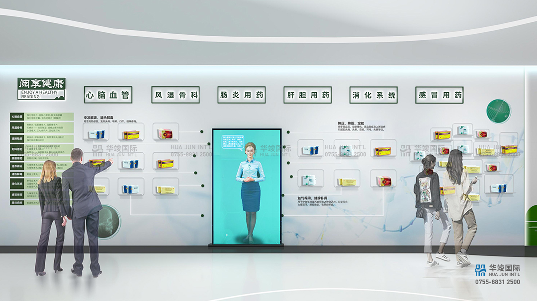 以漢王明星產品為引領,以“感冒用藥、消化系統、風濕骨科、心腦血管”等功能使用分類,產品陳列結合LED查詢觸控屏,虛擬講解員對企業重點藥品的藥理知識進行解刨式、研究性分解展示,也可定點查詢漢王全系藥品的處方來源、功能主治與臨床研究等內容,在趣味互動中了解漢王全產品體系。打造科學、權威的藥品安全科普。