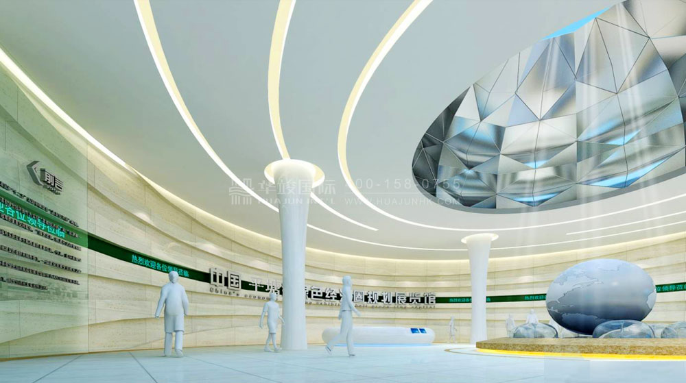 該展廳設計以“中國天眼”為設計靈感,用天眼(天坑)的科幻模擬造型,結(jié)合樓體外觀,整體打造“開眼看世界”的印象格局。利用磁懸浮技術(shù),設置多個球幕,在空中懸浮上升、下降,讓游客體驗天體運動場景,各球幕呈現(xiàn)當?shù)卮硇跃坝^。并通過虛擬導游的方式,游客可具體了解本地各個景區(qū)的信息,合理規(guī)劃旅游行程安排。還以交通規(guī)劃切入,按動觸控屏,即可點亮河流帶,實現(xiàn)實時交通交互;可查詢到周邊的交通規(guī)劃,吃、住、行、游、購、娛旅游產(chǎn)業(yè)鏈等。