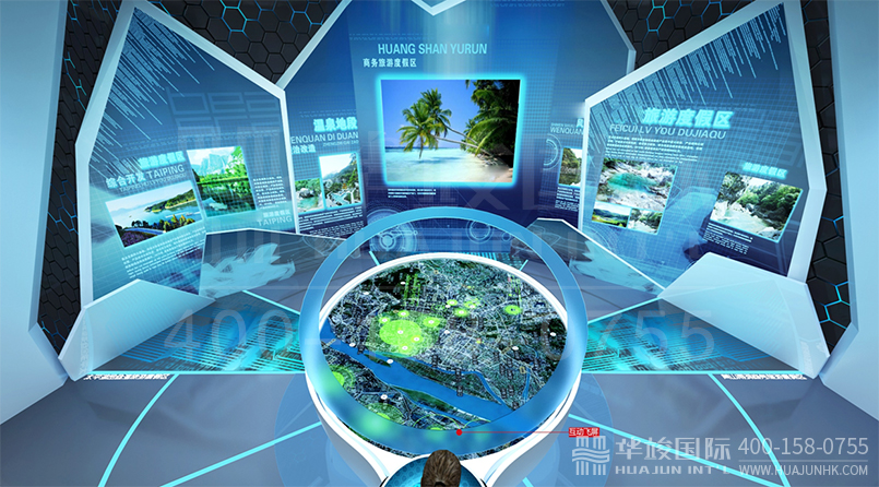 旅游業——全域旅游交通,以海口當前重點規劃的美蘭機場、高速公路、跨海大橋等為核心。一方面通過實體模型反映城市交通的立體格局,另一方面結合顯示大屏,全面體現海口交通的便捷,為全域旅游奠定基礎。