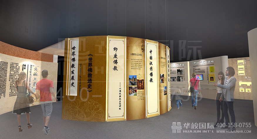 在華竣國(guó)際臨展落地作品“漢傳佛教多語(yǔ)種翻譯成果展”中,設(shè)計(jì)師從佛教在世界、在中國(guó)的發(fā)展歷程,設(shè)計(jì)世界佛教發(fā)展史、漢傳佛教種類(lèi)、中國(guó)禪宗、海上及陸上絲綢之路、世界絲路高僧、中英佛教百科全書(shū)、經(jīng)書(shū)譯作等展示板塊。通過(guò)物體識(shí)別、互動(dòng)投影、拼接多點(diǎn)觸控屏、題字墻等多媒體展示手段,實(shí)現(xiàn)觀眾與佛教文化的現(xiàn)場(chǎng)互動(dòng)。